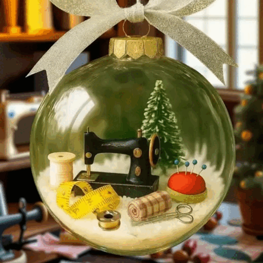 🥰Inside this delicate globe is a tiny world any sewist would adore: a vintage sewing machine, rolls of fabric, a cheerful mini Christmas tree, and the little essentials we can’t live without — tape measure, pincushion, scissors, and bobbins — all nestled in a bed of snowy sparkle.